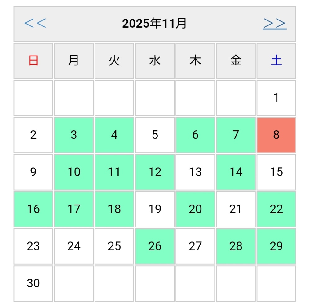 2025/11のレッスン日は下記のとおりです。なお、11/8は午前10時~、午後13時~、午後15時15分~の3レッスンがあります。空き状況については随時ホームページ(https://www.hinapatch.net/)にて更新しています。